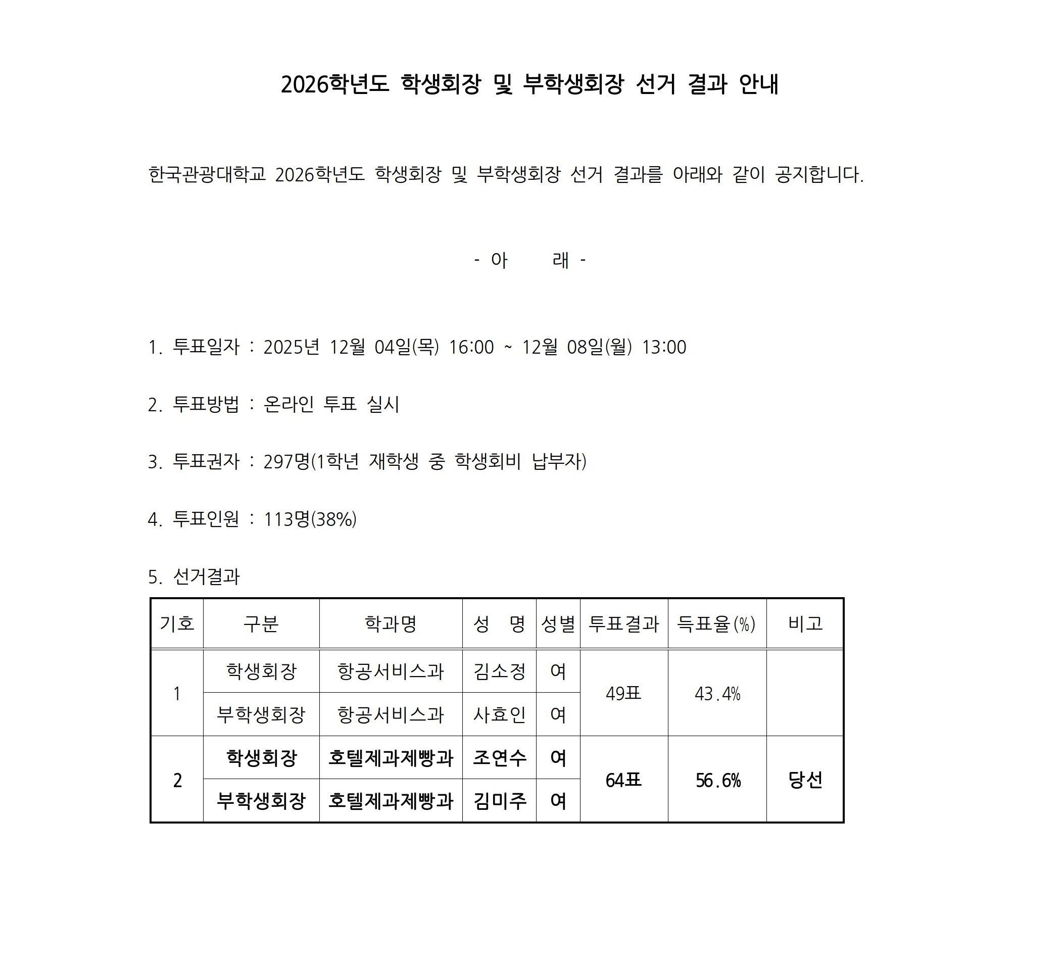 2026학년도 학생회장 및 부학생회장 선거 결과