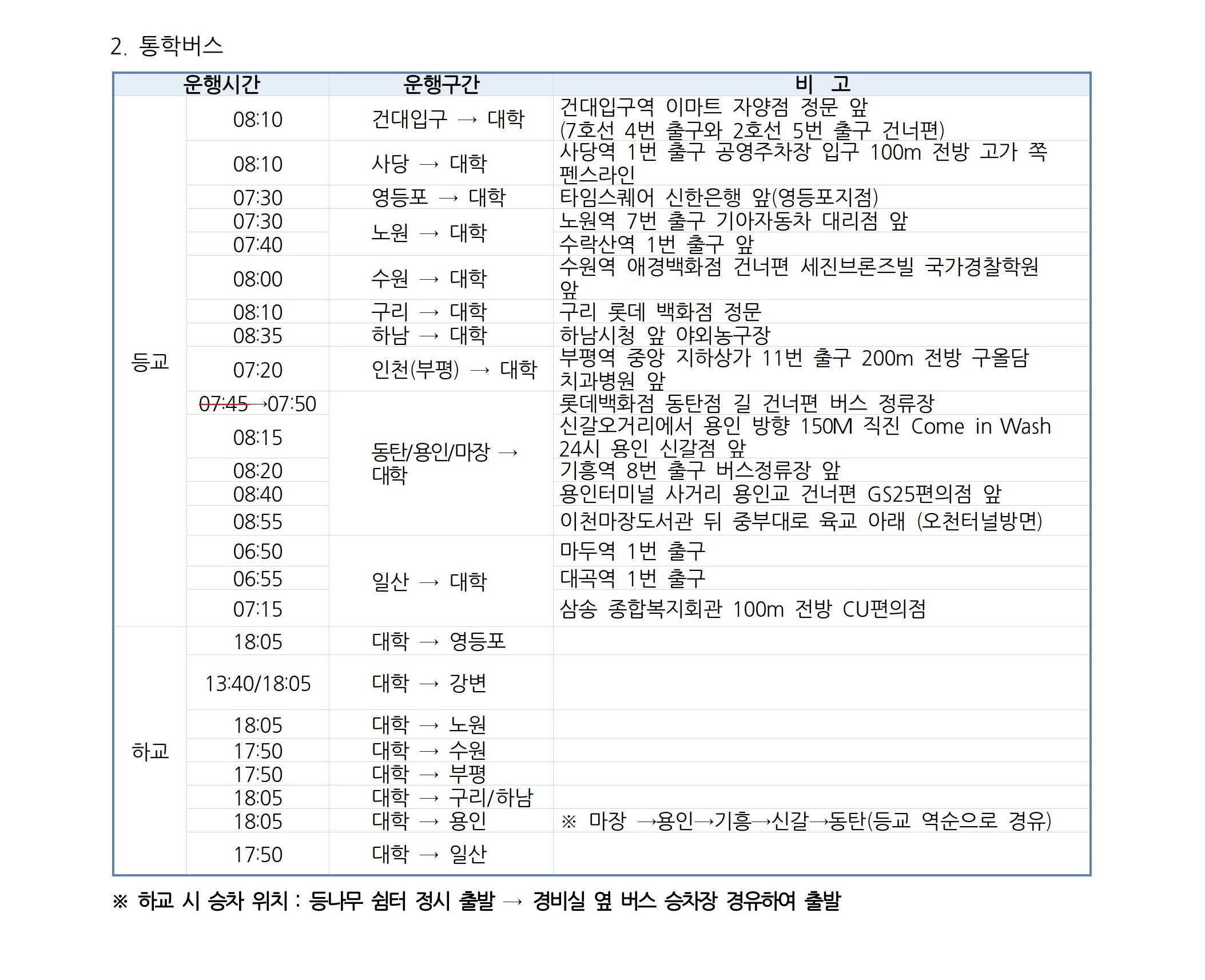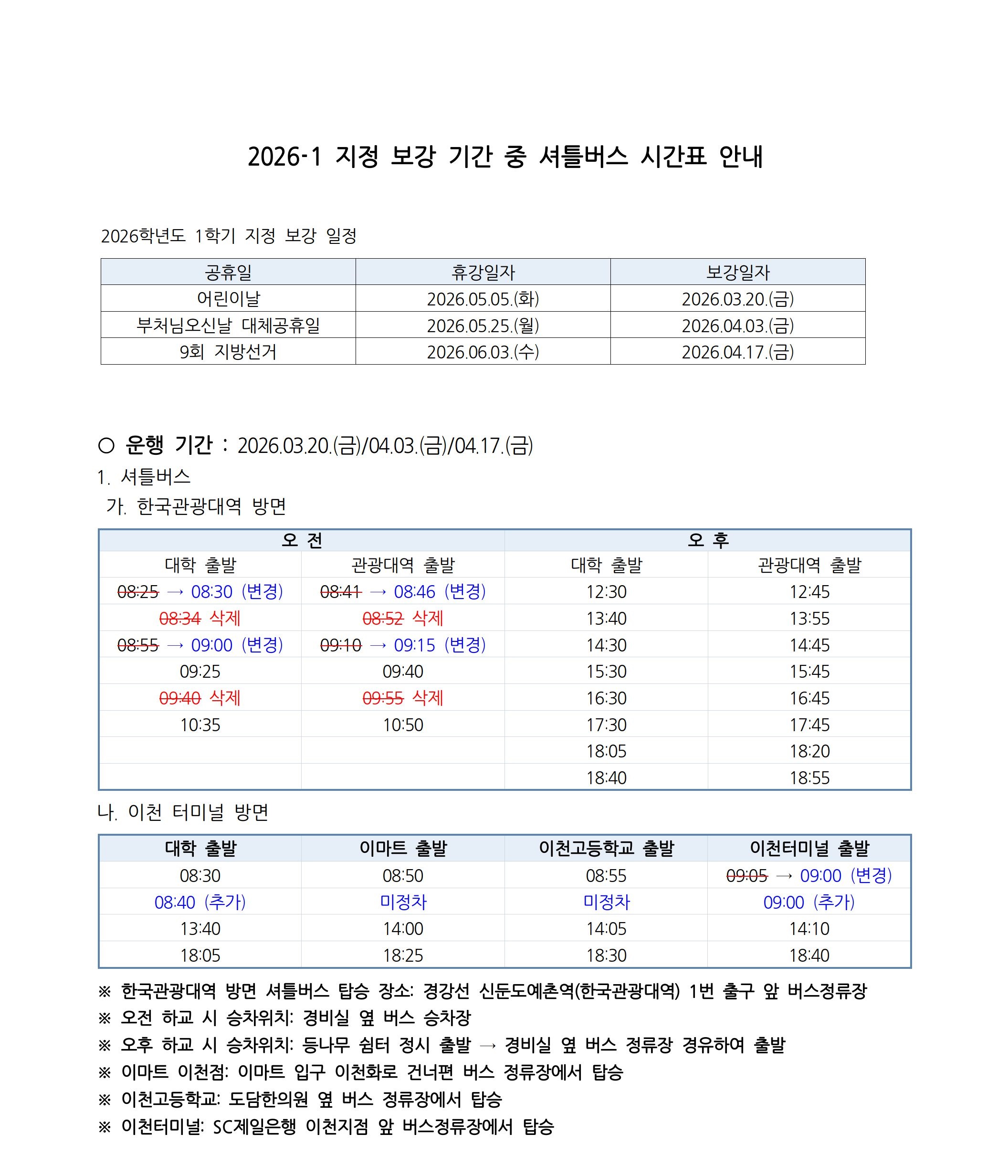 2026학년도 1학기 지정 보강 기간 중 셔틀버스 시간표 안내(2026.03.23.기준)