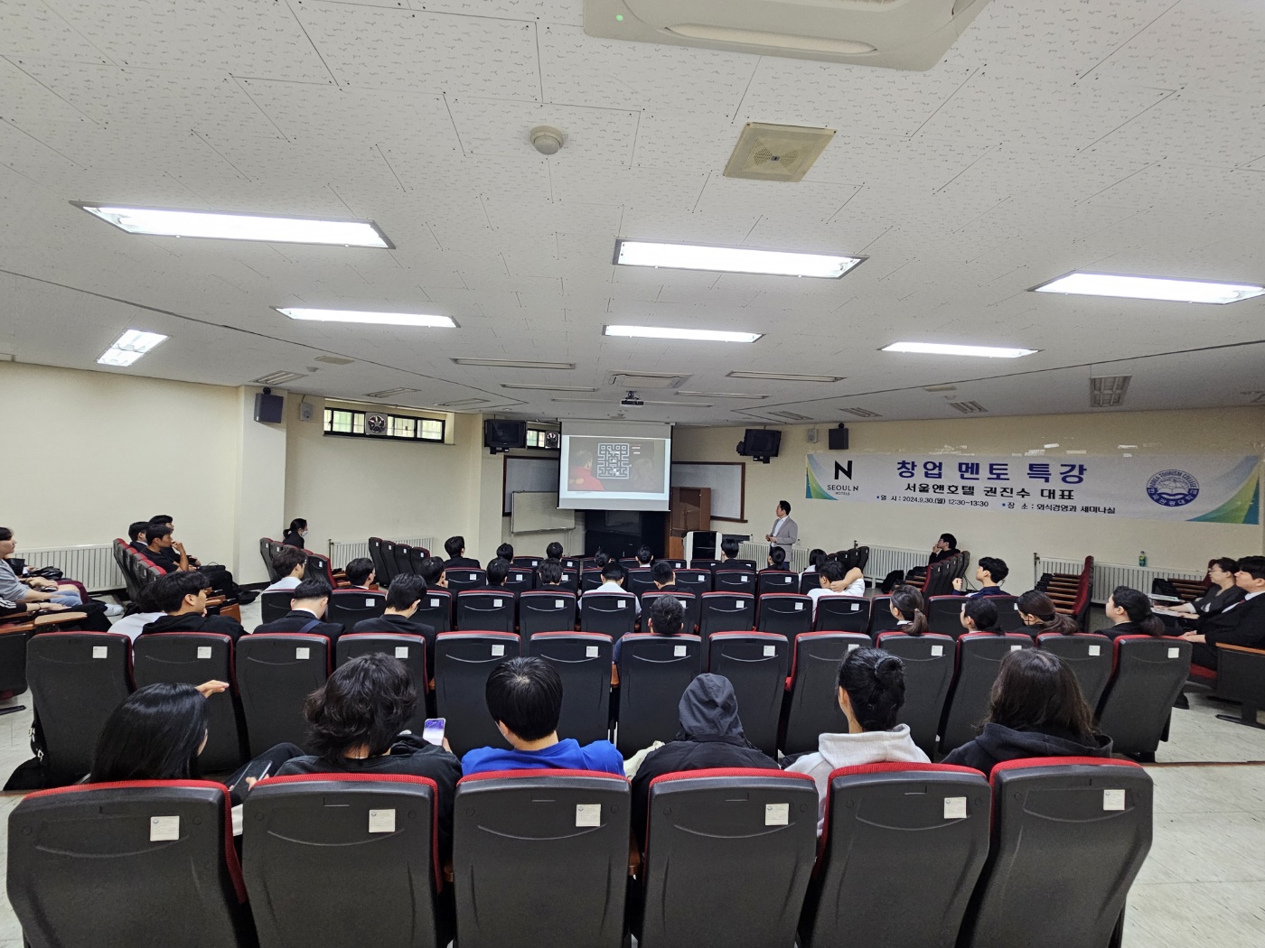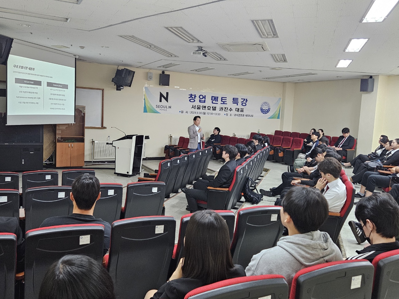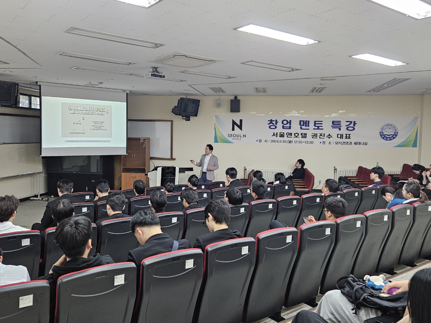 2024년 9월 30일(월) 한국관광대학교(총장 최형인) 취·창업지원센터는 전문대학 혁신지원사업의 일환으로 권진수 대표(現 서울앤호텔 대표)를 초청하여 ‘꼬마빌딩으로 호텔 창업’이란 주제로 창업멘토특강을 운영했다.