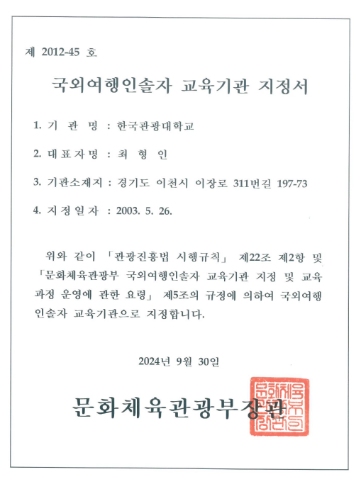 한국관광대학교 국외여행인솔자(TC) 21년 연속 교육기관 선정