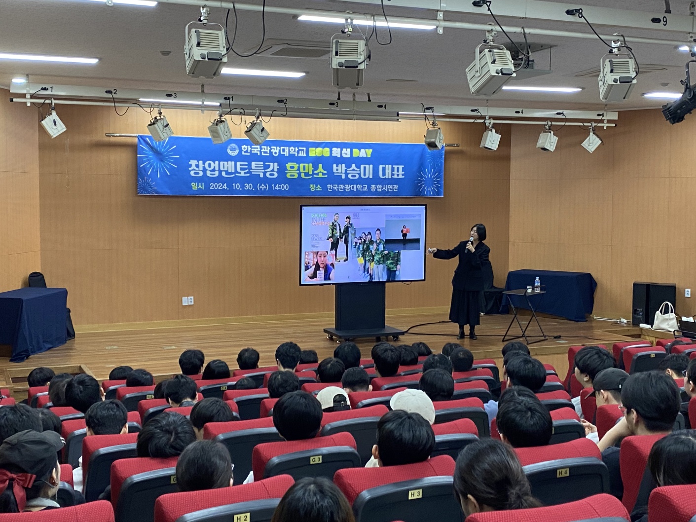 한국관광대학교(총장 최형인) 취·창업지원센터는 ‘ESG 혁신 DAY’를 맞이하여 지난 10월 30일과 31일 양일간 본관 종합시연관에서 창업멘토특강을 운영했다. 이번 특강은 창업역량 강화 및 ESG 창업에 대한 이해도를 높이기 위해 마련되었으며 박승미 대표(흥만소)와 김태희 협회장(한국미식관광협회)을 초청하여 진행했다.